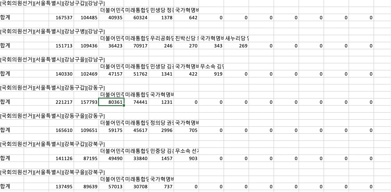 os.chdir("/Users/xxx/Downloads/제21대 국회의원선거(재보궐 포함) 투표구별 개표결과/지역구/1서울")
