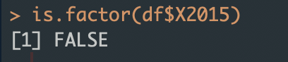 is.factor()라는 함수를 쓰는데 이 때는 어떤 칼럼을 테스트할지 적어줘야 합니다. 예를 들어 df라는 데이터프레임 중에 X2015라는 칼럼이 팩터인지 여부를 알고 싶다고 하면 그냥 is.factor(df$X2015)하면 되겠지요?