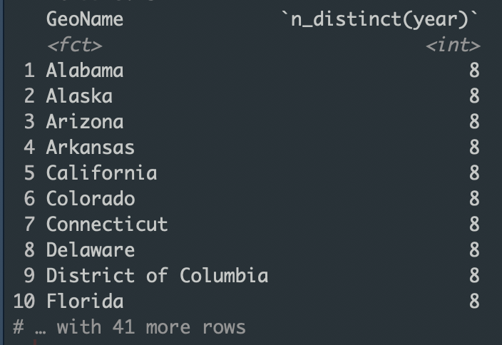 그럼 조금 더 구체적으로 "각 주"별로 연도는 얼마나 있냐 이걸 알고 싶다고 한다면 여기서는 group_by()를 통해서 일단 그룹을 묶어주고 거기서 고유값을 계산하라고 하면 됩니다.