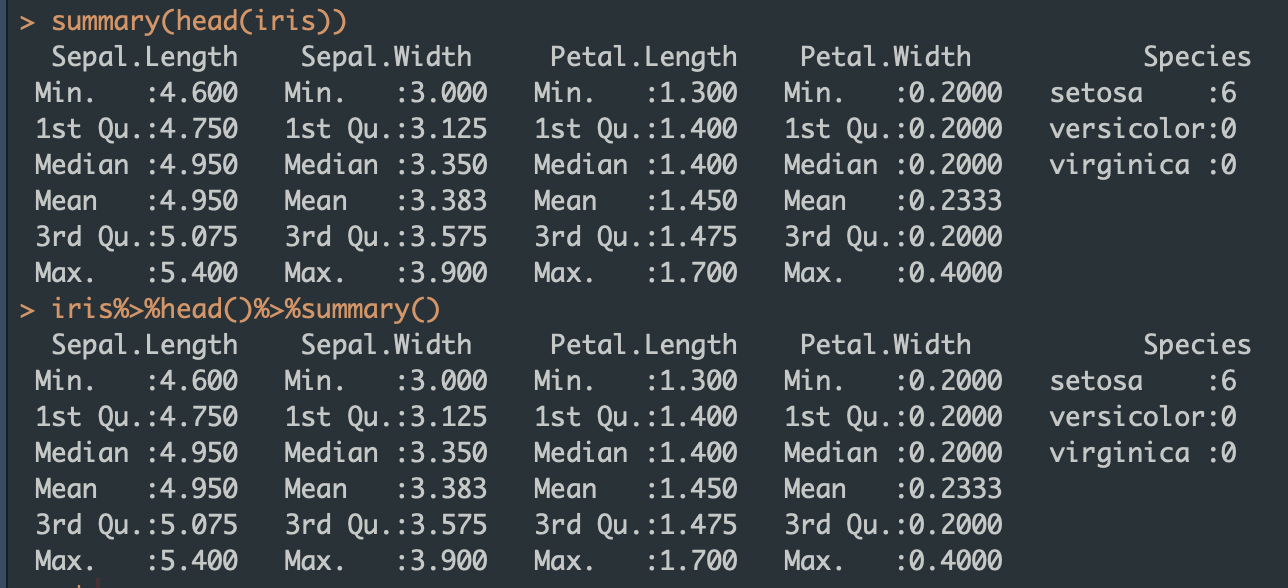 예를 들어 iris %>% head() %>% summary() 이런 게 있다고 하면